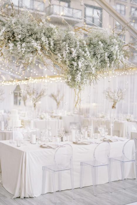 Falon wanted her all-white wedding to feel organic and to play off the beautiful alpine scenery. Together with her mom, Geri Miskelly, and planner, Ivory & Vine Event Co.’s Karli Spangler, she created a day full of texture and asymmetry, using different tones to bring the neutral affair to life. An important part of this plan was the lack of greenery in the floral arrangements. “We wanted to stay away from a Bohemian vibe, which is tricky,” says florist Hailey Khan of Venus and Co. Instead, she created a whimsical hanging display for the tented reception, using various types of orchids and dried florals.
