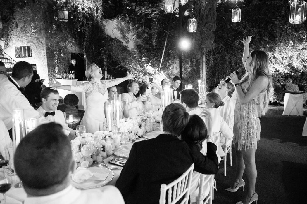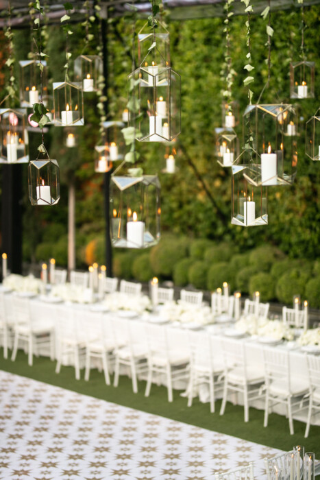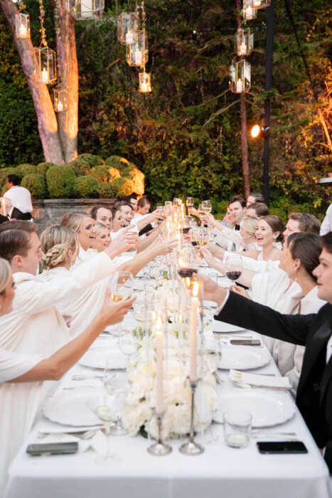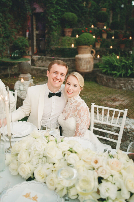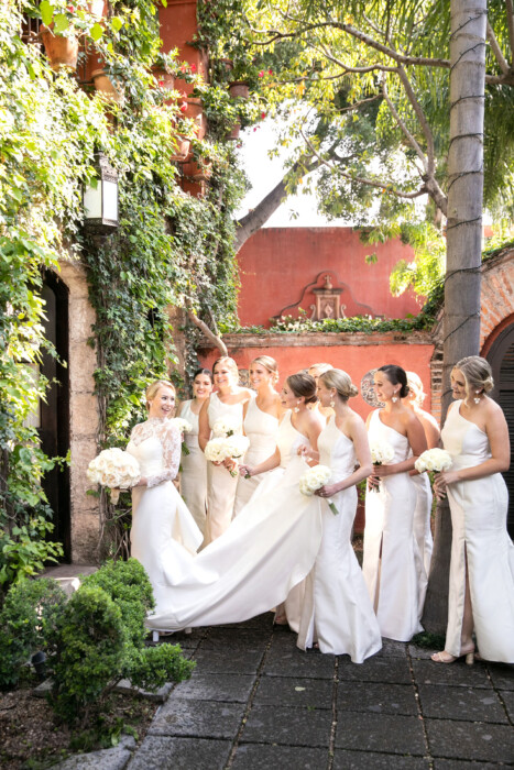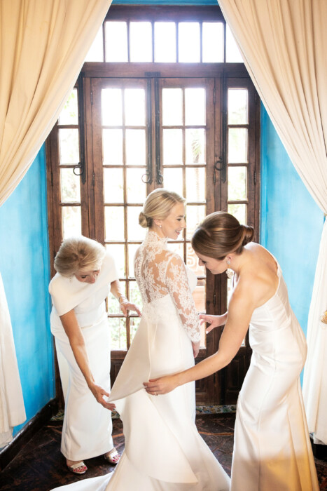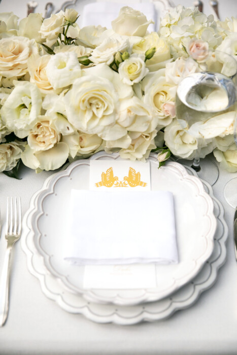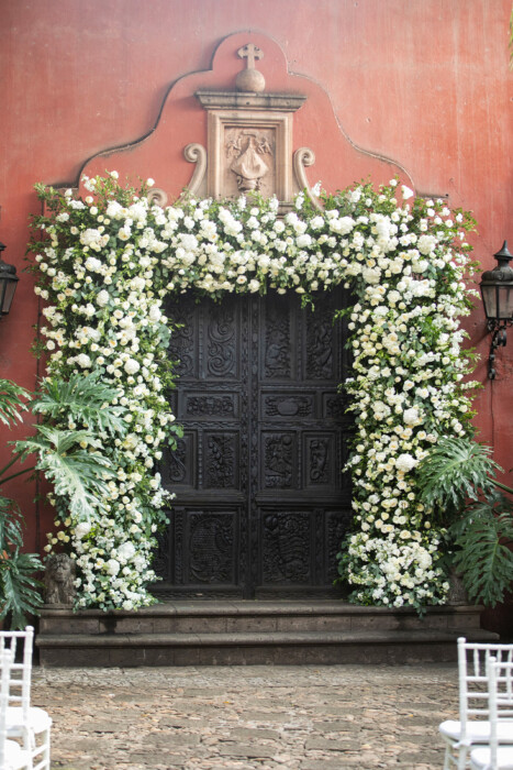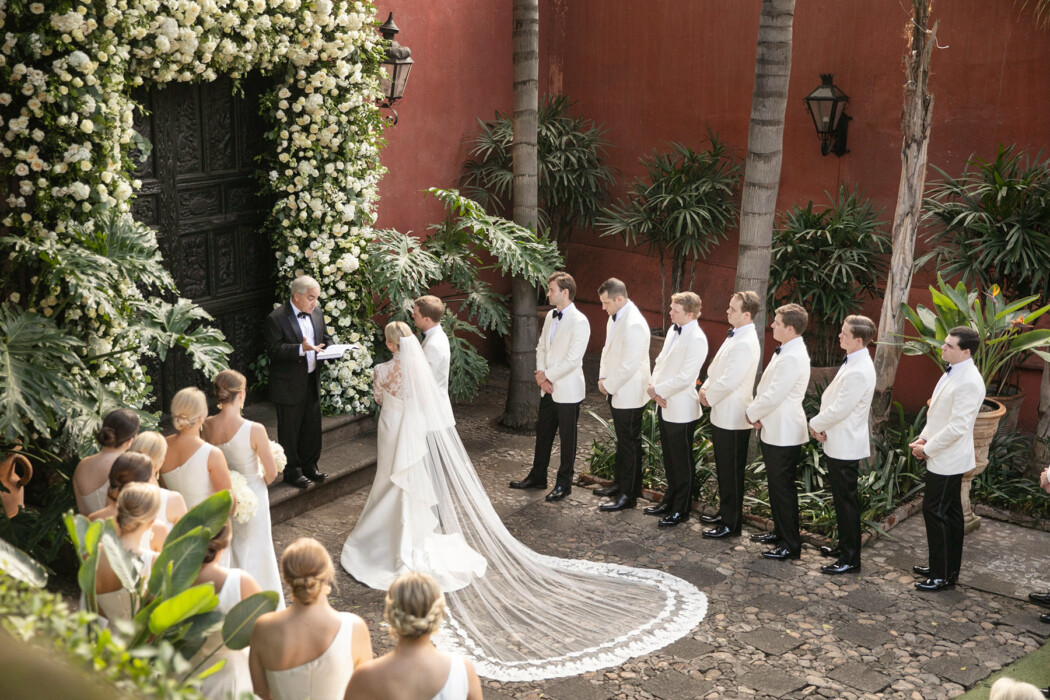 The bride and groom said “I do” in front of 80 guests in Casa Hyder’s romantic courtyard, which featured a grand arch of white roses framing massive double doors. “It had rained all day, but when we got married at 5 p.m., the weather was absolutely perfect,” says Steele.