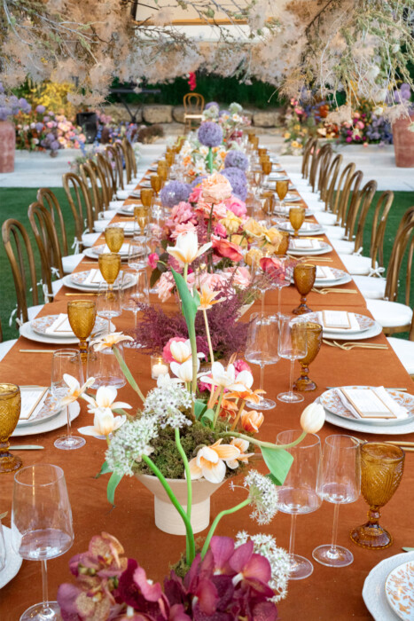 Taking her cues from the Bishop’s Lodge adobe exteriors, Emily piled in plenty of Southwest-infused furnishings near the bar so guests could sit and sip in style. “I knew I wanted to create collections on the tables where each bloom had its moment, so I isolated ranunculus, roses, and reflexed tulips in blocks. Where we do mix flowers, it’s very intentional,” says Emily.