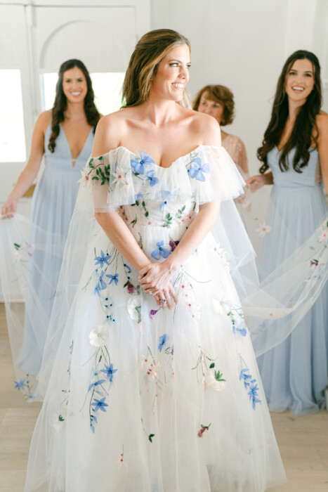 Although she was sure she didn’t want a dress that was off-the-shoulder or colorful, Kathryn ended up with something that was both. “I tried on this dress first, and my mom and sisters knew it was the one right away,” she says. “Even so, I still dragged them to four other places before coming back and getting it.”