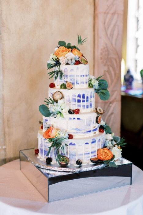 Matthew, an avid baker, researched cake designs for months, ultimately landing on an eclectic style dotted with natural florals and fruits. Dallas Affaires Cake Co. brought the look to life, with each tier made in a different flavor—including Mexican chocolate with Kahlua filling and champagne with fresh-sliced strawberries—to appeal to guests’ varied tastes.