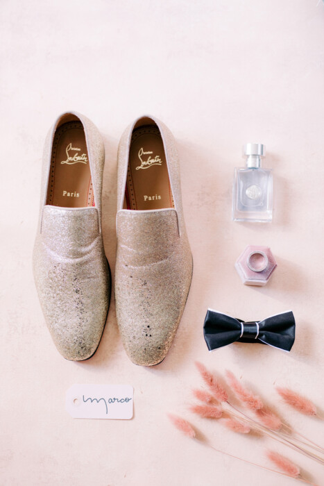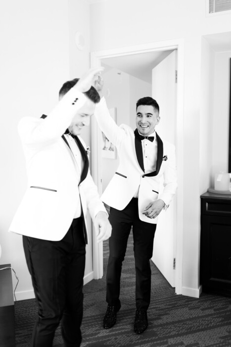 “I wanted something to set the mood for the reception,” says Matthew, who, after an extensive search, found these Tom Ford–inspired pink velvet blazers that fit the bill.