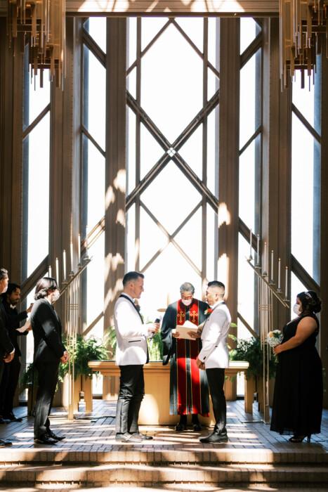 Grooms Matthew Warren and Marco Vivian have been “inseparable ever since” the fates of online dating brought them together on March 20, 2018. They planned to tie the knot exactly two years later but were forced to delay their celebration in the face of COVID. “It was a really tough time for us because we had put so much passion, time, and love into that moment,” says Matthew. In order to keep their sentimental March 20 wedding date, the couple held a Mexican-influenced reception on Saturday and exchanged vows the previous afternoon. Splitting the celebrations allowed for guests and newlyweds alike to slow down and enjoy each moment—like Matthew singing John Legend’s “All of Me” to Marco as he ascended the aisle. Remembers Marco: “It was beautiful and magical.”