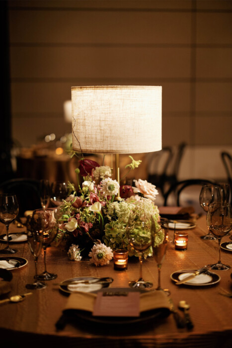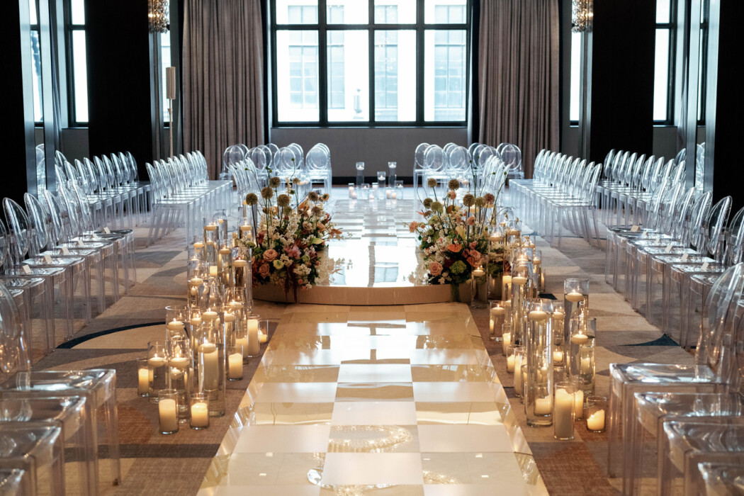 To provide guests with an unobstructed view of the couple’s vow exchange, which took place in the Joule’s secondary ballroom, Leslie used an in-the-round approach, placing seats on three sides of the altar.