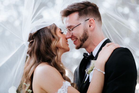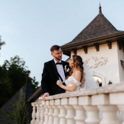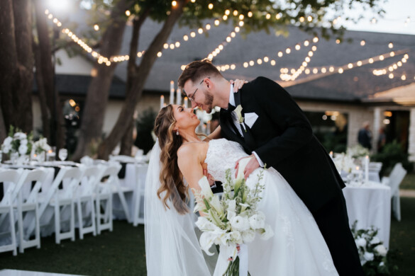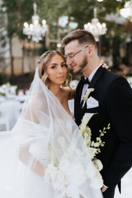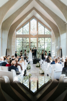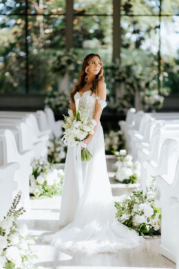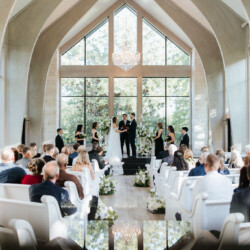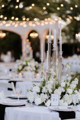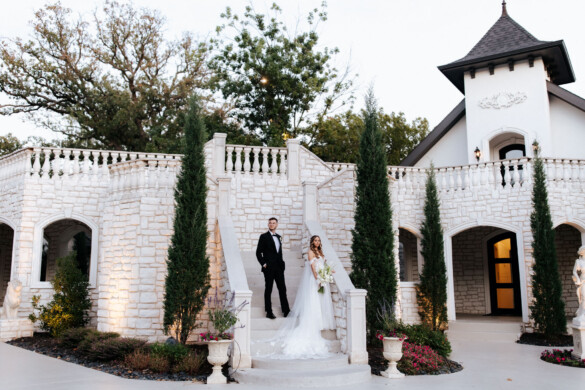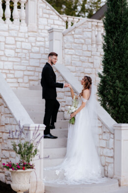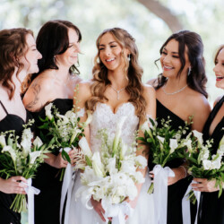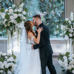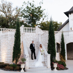 The wedding’s dramatic black-and-white color palette set a sophisticated tone. Boujee Bloom brought the vision to life with exquisite florals — cascading orchids, calla lilies, and roses accented by lush green hydrangeas and sparkling chandeliers. Lindsey stunned in a Justin Alexander gown, her classic bridal elegance mirrored by the venue’s natural light and romantic stone architecture.