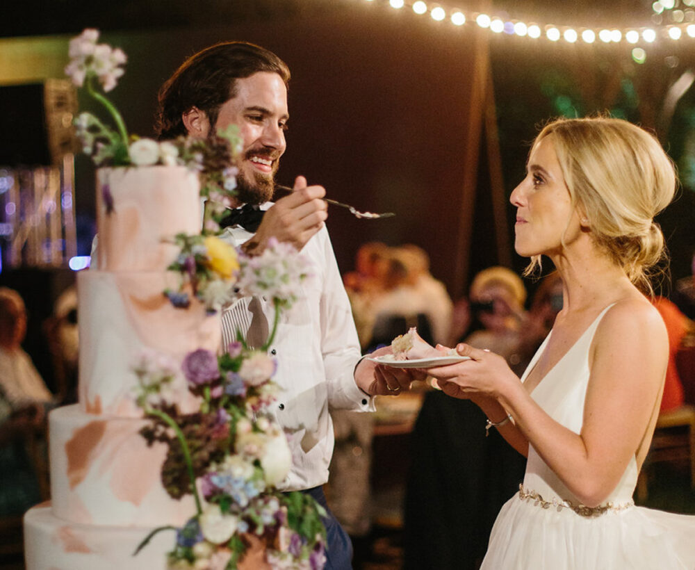 “The couple should cut the first slice of cake, which always makes for such a cute photo, then let the pros do the rest. While the guests have their slices served to them, it’s a great time for the newlyweds to get some extra mingling time—and a good chance to visit with some of the guests who may not be joining them on the dance floor.”