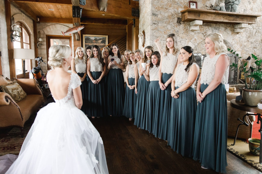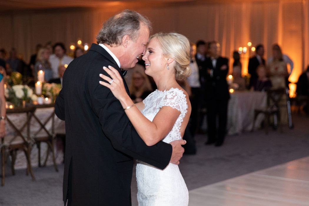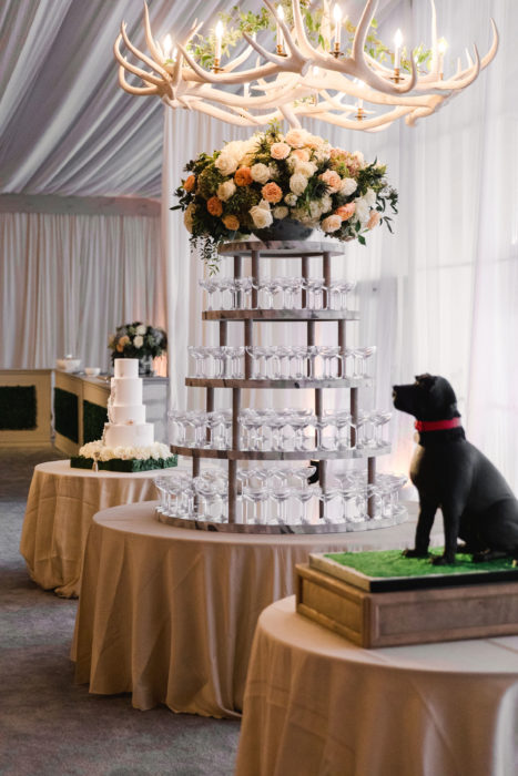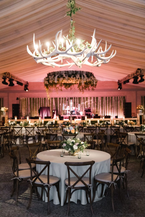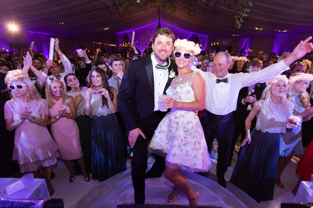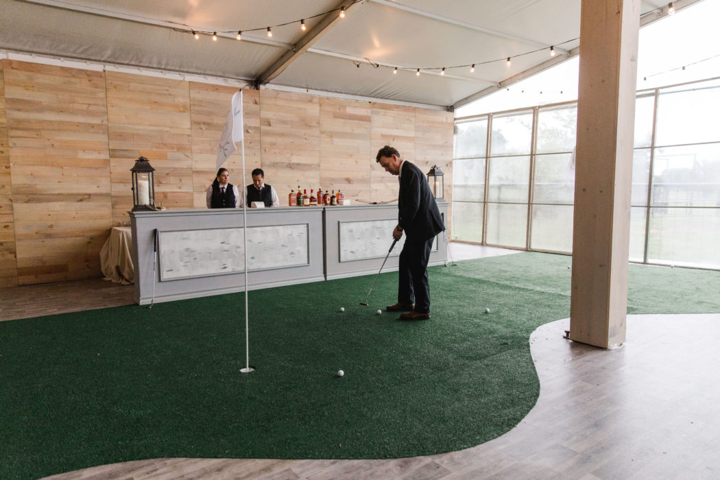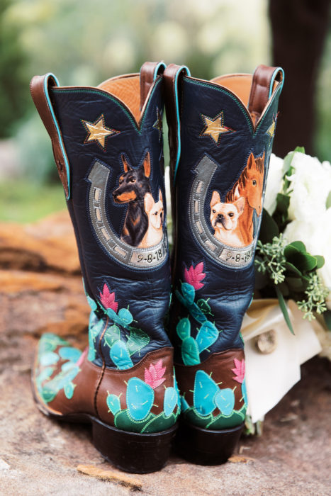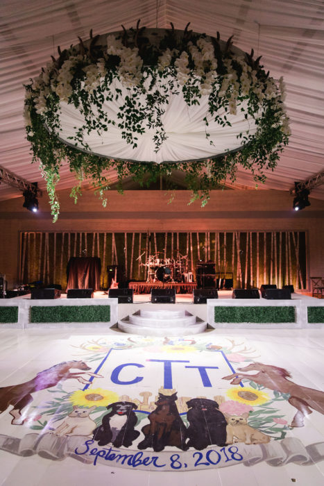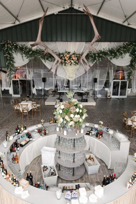 From start to finish, Claire and Travis put on a real party. You want it? They probably had it. During cocktail hour, the couple gave their guests a putting course, a cigar bar, a bourbon bar, and a regular bar, which served as a focal point in the center of the room. They also brought in Pete’s Dueling Pianos, a photo booth, and Steel City Pops. Claire and Travis also sealed their dance floor with a logo that matched Claire’s boots.