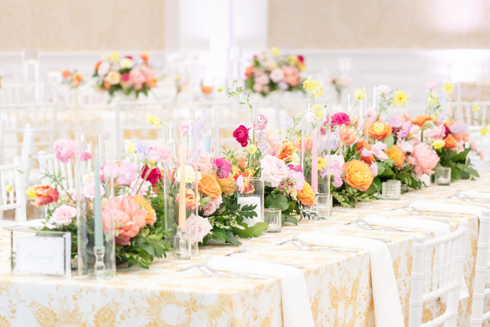 Nothing says Southern like a good floral fabric. With the help of planner Chloe Allday, Emily Church and Brendan Keegan brought a touch of sunny style to their Arts District Mansion reception. “Golden hour is my favorite time of day, so I wanted to bring in warm golden yellow tones,” Emily says. “The patterned linens did just that.”
