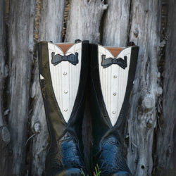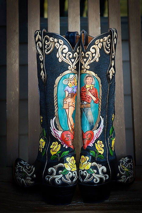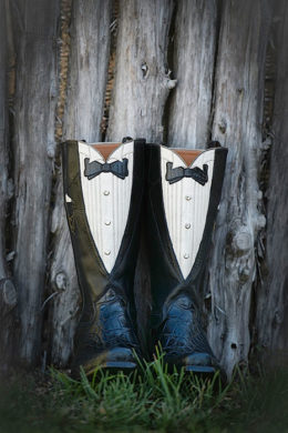 It only made sense for cowboy Todd Quirk and cowgirl Elizabeth Brumbaugh—who met on a ranch—to wear boots on their big day. Elizabeth’s featured an image of the couple, and the groom’s pair were made to look like tuxedos, perfect for the special day.