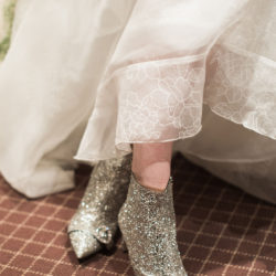 Naomi Bowen chose to don white Miron Crosby boots—personalized with her new initials and wedding date—for her ceremony. Both Naomi and groom Michael Weissman changed into Air Force 1s for the reception. Tall, tomboy bride Alexis McDonald isn’t much of heel-wearer, and she didn’t want to change that on her wedding day. Thankfully, Alexis’ mom came through with a pair of glittery Golden Goose boots from Neiman Marcus.