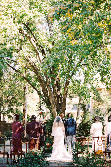 Yolanda selected the colors and let Wendy orchestrate an elegant wedding with lavish flowers from The Southern Table and a textural teal-hued cake by Layered Bake Shop bedecked in blooming peonies. The couple and their six-guest entourage arrived at the Aldredge House on that cool, sunny November day and felt the magic from the beginning.